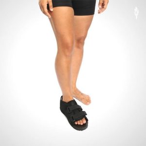Posicionar la varilla en el lateral del dedo gordo del pie. Ajustar su abrojo superior alrededor del dedo gordo del pie, su segunda tira pasarla por debajo de la planta del pie y cerrarla en el empeine, y por último, su cierre posterior pasarlo alrededor del tobillo, ajustándolo en el empeine.