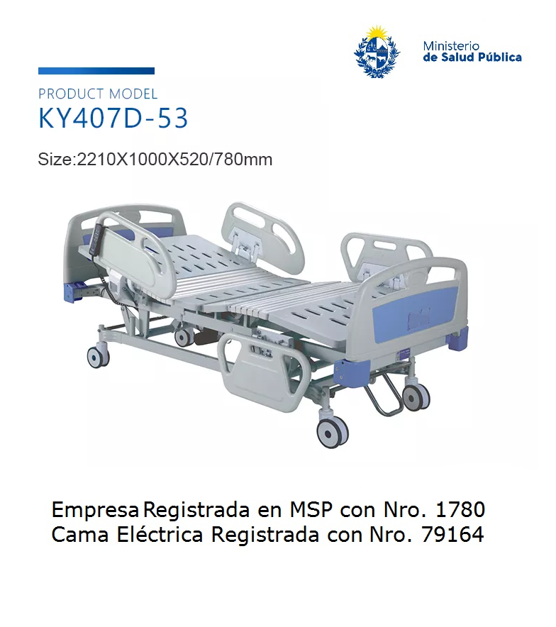Cama eléctrica marca Kaiyang Medical, 5 funciones, con movimientos de variación de altura, elevación de respaldo y piernas, trendelemburg y trendelemburg inverso, modelo KY 407D-53 procedencia China.